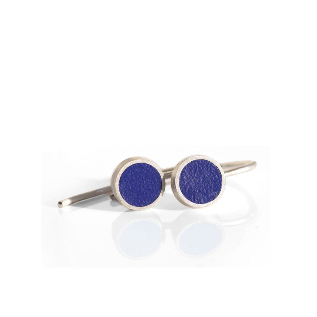 Øreringene er lavet af melaminplade i forskellige farver kombineret med sølv.